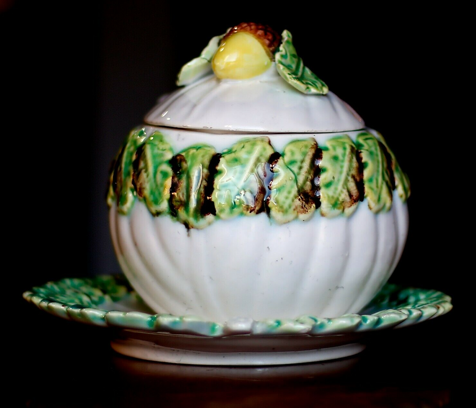 Vintage Italian Acorn & Leaves Handmade Ceramic Jam Jar w/ Lid, Spoon, & Saucer